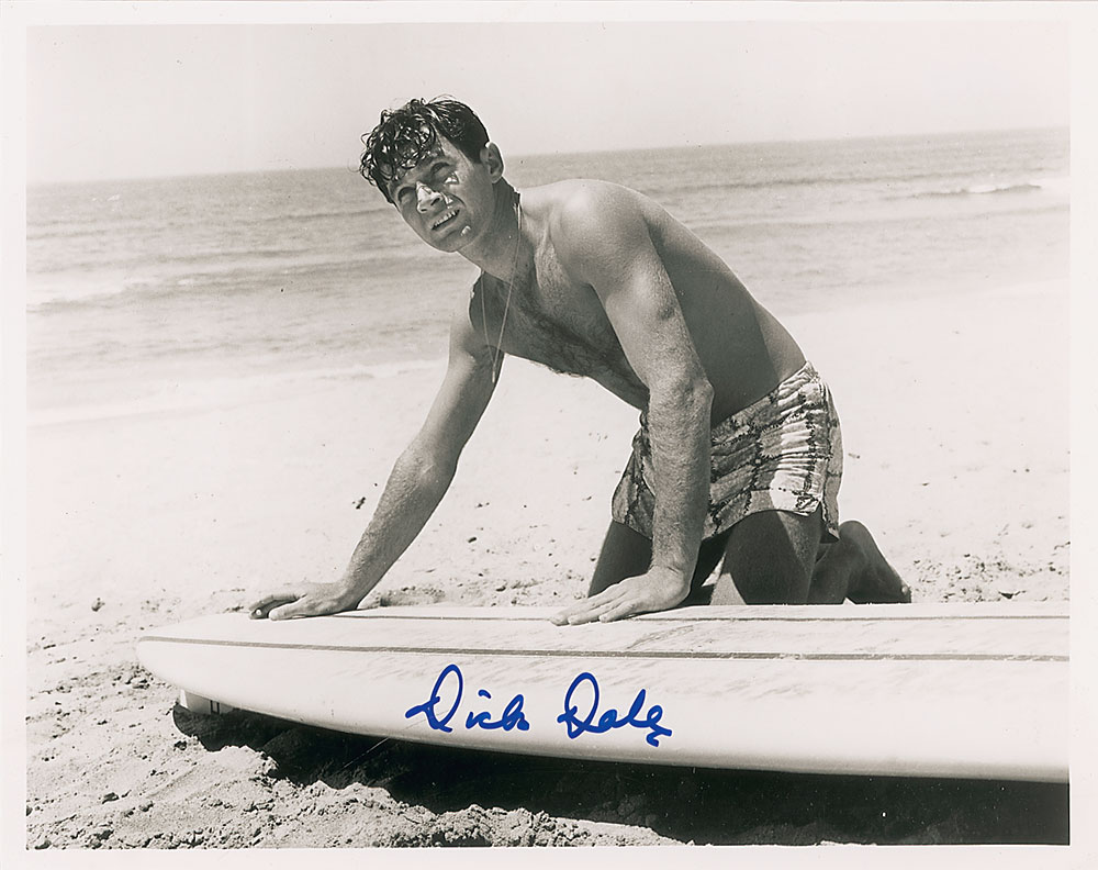 Glossy 10 x 8 photo of Dale on the beach with a surfboard, signed in blue felt tip. In very fine condition. RR Auction COA.