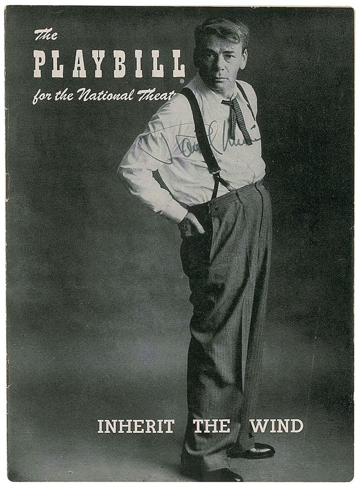 Academy Award winner (1895–1967) considered Warner Brothers’ most prestigious actor during the 1930s. Playbill from the National Theatre’s 1956 production of Inherit the Wind, 6.5 x 9, 29 pages, signed on the front cover in black ink by Muni. In fine condition, with light handling wear. Pre-certified PSA/DNA and RR Auction COA.