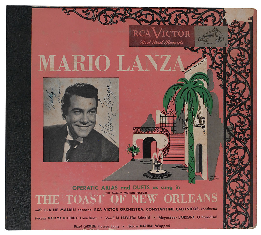 Toast of New Orleans album signed vertically on the front cover in fountain pen, “Hello, from, Mario Lanza.” In very good condition, with light scattered surface loss and foxing to the cover, separations to edges of inner sleeves, and slight brushing to the sentiment. Two of the three records are included. RR Auction COA.