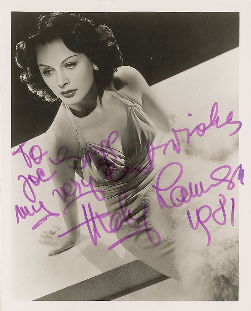 Pretty glossy 8 x 10 photo of Lamarr, signed and inscribed in purple felt tip, “To Joe Gregg, my very best wishes, Hedy Lamarr, 1981.” In fine condition. Pre-certified PSA/DNA and RR Auction COA.