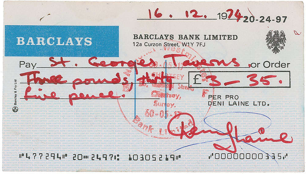 Bank check, 6 x 3.25, filled out and signed by Laine, “Denny Laine,” payable to St. Georges Taverns for £3.35, December 16, 1974. Light overall wrinkling, expected bank stamps, and a ballpoint cancellation notation through a small portion of the signature, otherwise fine condition. Pre-certified Roger Epperson/REAL and RR Auction COA.