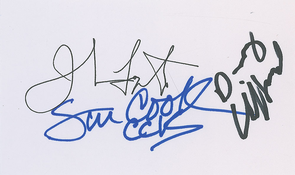 Felt tip signatures of John Fogerty, Stu Cook, and Doug ‘Cosmo’ Clifford on an off-white 5 x 3 card. In fine condition. Pre-certified Roger Epperson/REAL and RR Auction COA.