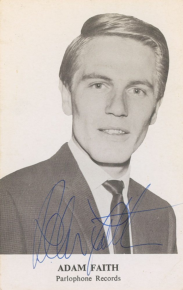 British teen idol (1940–2003) who was one of the most charted acts of the 1960s. Vintage 3.5 x 5.5 Parlophone cardstock publicity photo, signed in blue ballpoint. In fine condition. RR Auction COA.