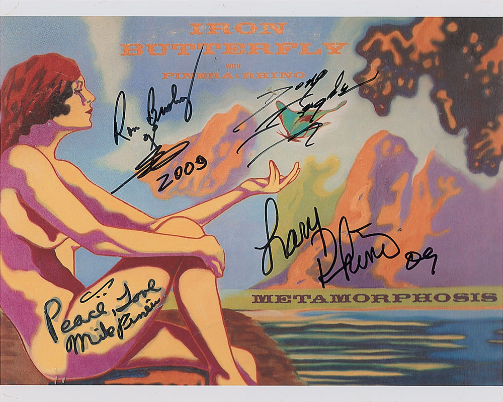 Color glossy 10 x 8 photo of the Metamorphosis album cover, signed in black felt tip by Doug Ingle, Mike Pinera, Ron Bushy, and Larry Rhino. In fine condition, with Pinera tracing over a previous signature. RR Auction COA.