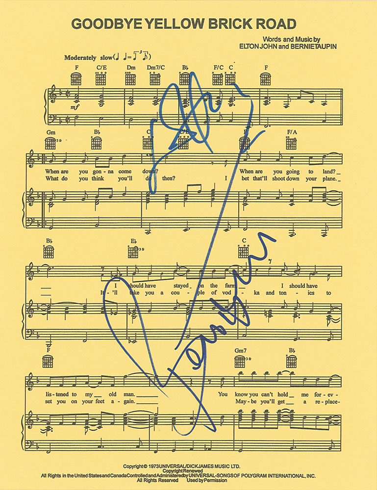 Printed sheet music to ‘Goodbye Yellow Brick Road,’ on four yellow 8.5 x 11 pages, signed on the first page in blue felt tip by Elton John and Bernie Taupin. In fine condition. Pre-certified Roger Epperson/REAL and RR Auction COA.