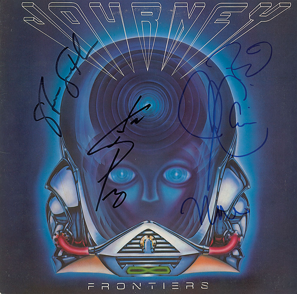 Frontiers album signed on the front cover in blue and black felt tip by Steve Perry, Neal Schon, Jonathan Cain, Ross Valory, and Steve Smith. In fine condition. The record is not included. Pre-certified Roger Epperson/REAL and RR Auction COA.