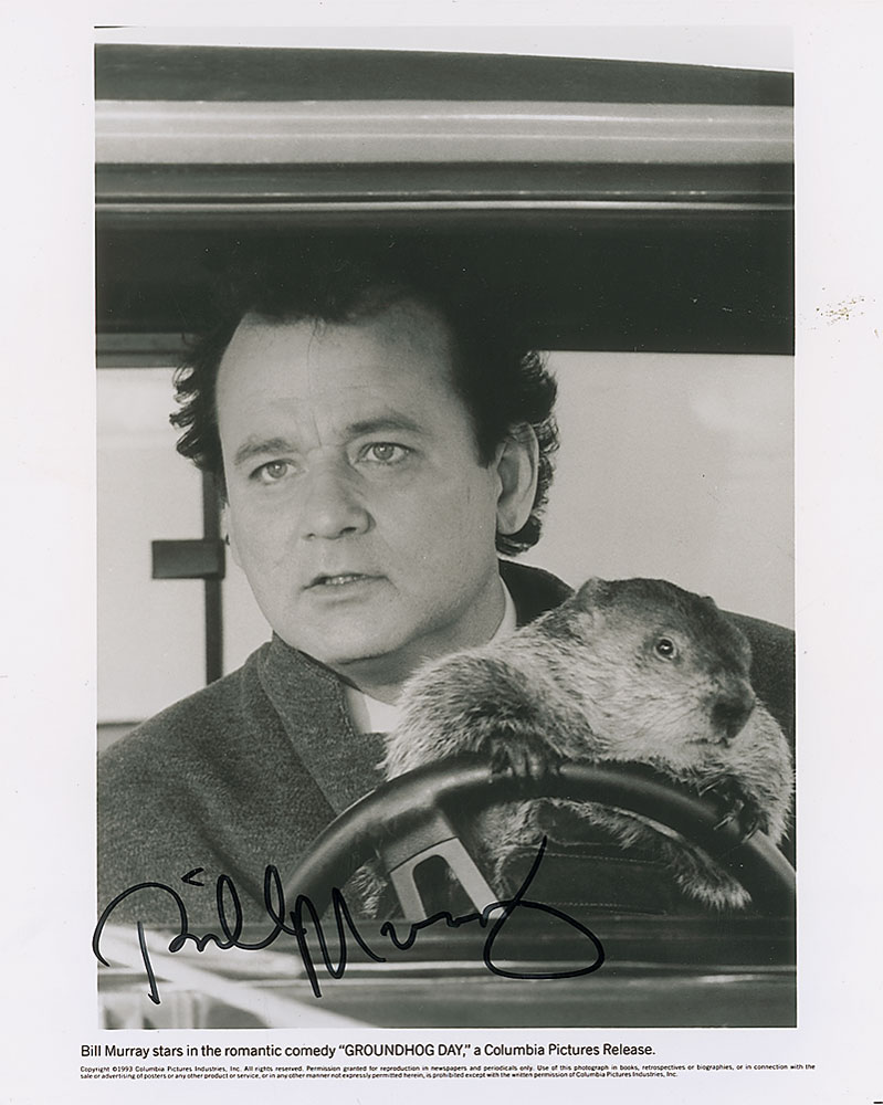 Glossy 8 x 10 Columbia Pictures promotional photo for Groundhog Day, signed in black felt tip. In fine condition. Pre-certified PSA/DNA and RR Auction COA.