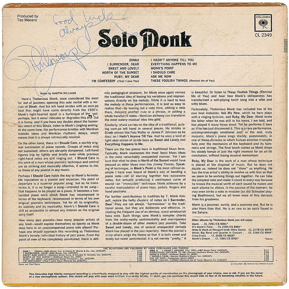 Idiosyncratic pianist, composer, and arranger (1917–1982) who takes a place among the most innovative and influential figures of modern jazz. Solo Monk album signed on the back cover in blue ballpoint, “Good luck always, Thelonious Monk.” Partial separation to top edge, scattered light soiling and wear to covers, and a mild ‘ring of wear’ to front cover, otherwise fine condition. The record is included. Released in 1965, Solo Monk was heralded as the choice album to have from Monk’s solo work. Monk is quite rare in any form, particularly in signed albums. Pre-certified Roger Epperson/REAL and RR Auction COA.