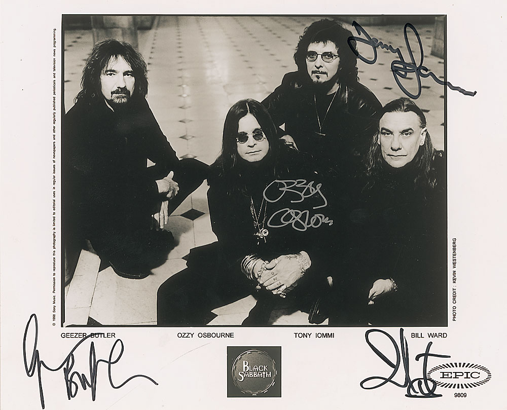 Satin-finish 10 x 8 Epic Records publicity photo, signed in silver ink by Ozzy Osbourne and in black felt tip by Tony Iommi, Geezer Butler, and Bill Ward. In very fine condition. Pre-certified Roger Epperson/REAL and RR Auction COA.
