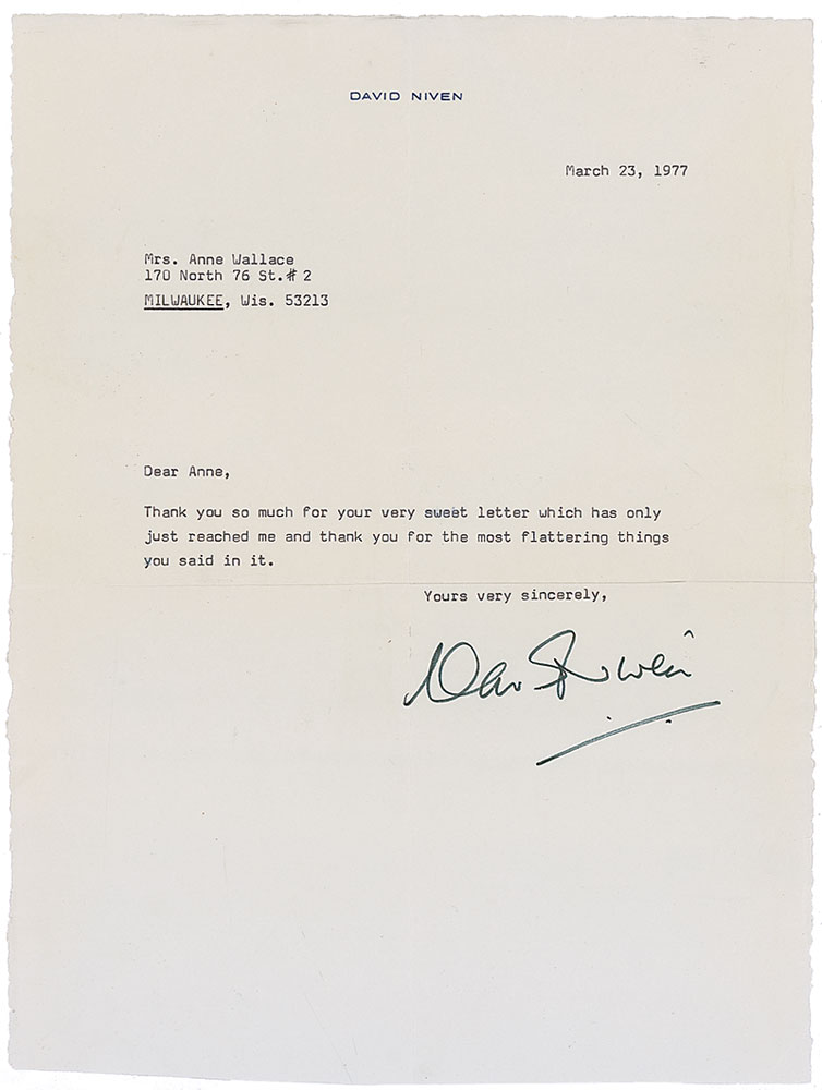 TLS, one page, 8.25 x 11, personal letterhead, March 23, 1977. Letter to an admirer. In full: “Thank you so much for your very sweet letter which has only just reached me and thank you for the most flattering things you said in it.” In fine condition, with central vertical and horizontal folds and slightly trimmed bottom edge. Pre-certified PSA/DNA and RR Auction COA.