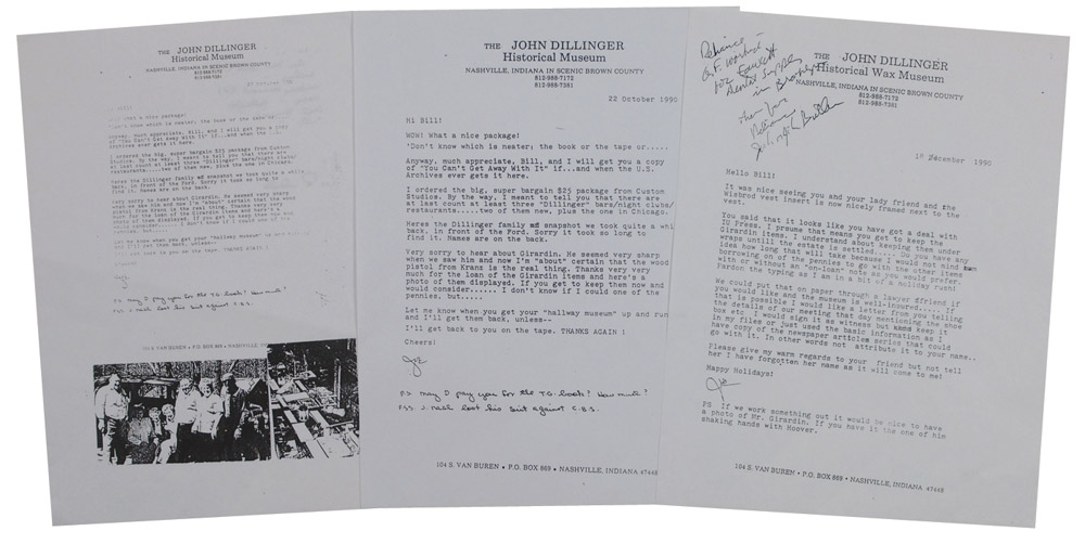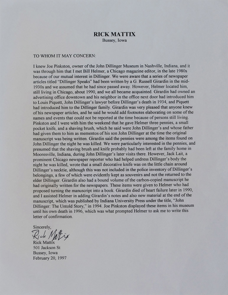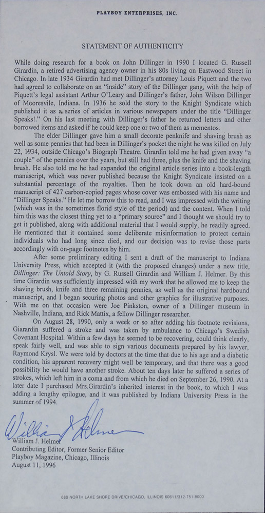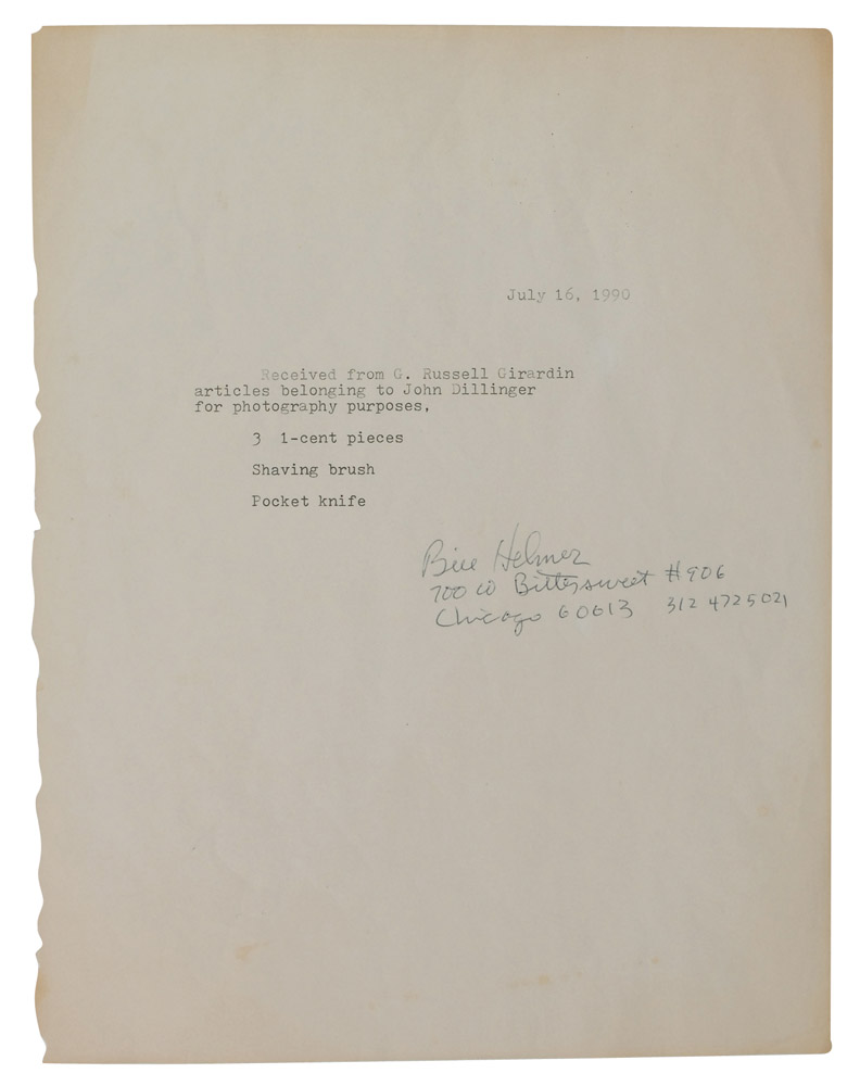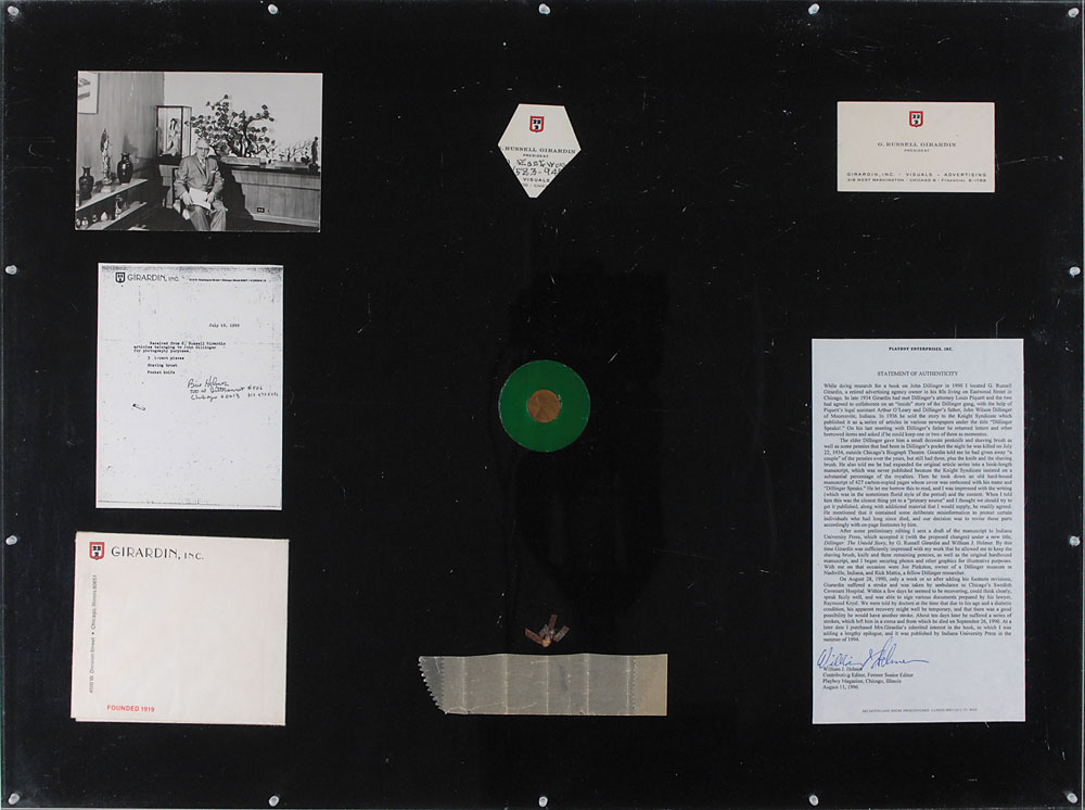 A 1920 Wheat penny recovered from Dillinger’s pants after he was killed outside the Biograph Theatre on July 22, 1934. Penny is accompanied by a 1996 statement of authenticity signed by William J. Helmer, Contributing Editor and former Senior Editor of Playboy magazine and author of seven highly regarded books on the subject of Depression Era gangsters, including Dillinger: The Untold Story. The penny and statement are framed behind Plexiglass along with a photocopy of a July 16, 1990, receipt from Helmer to G. Russell Girardin for the pennies, shaving brush, and pocket knife; a photo of Girardin; one of Girardin’s business cards, company letterhead, and another clipped business card, to an overall size of 24 x 18. Accompanied by: the original 1990 letter signed by Helmer acknowledging receipt of the Dillinger belongings from Girardin, “3 1-cent pieces, shaving brush, and pocket knife;” photocopies of two letters from Joe Pinkston of the John Dillinger Museum to Helmer, alluding to the Girardin items including the pennies; and an original letter from gangster historian Rick Mattix telling the story of how the Dillinger items came into Mr. Helmer’s possession. Also included are: two unsigned glossy photos, one of Girardin and the other of a deceased Dillinger on a stretcher, surrounded by a large crowd; two copies of Dillinger: The Untold Story, one hardcover limited edition #1/48 and one paperback, each signed by co-author Helmer.
