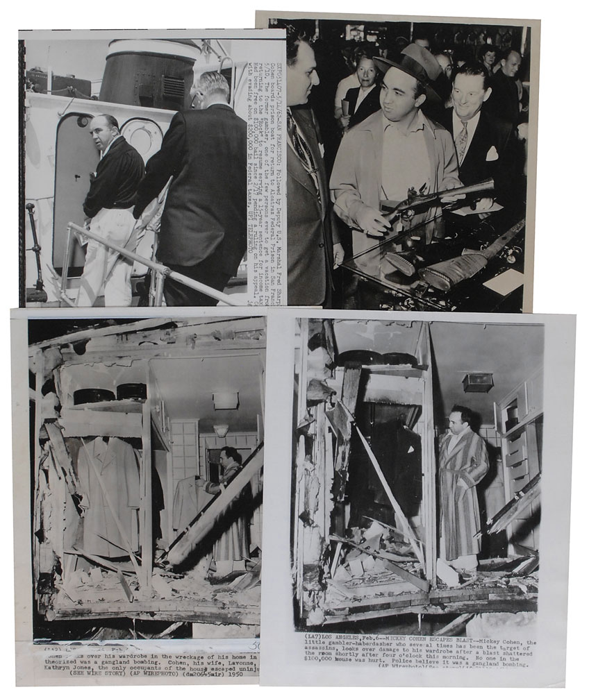 Gangster (1913–1976) born Meyer Cohen who was a trusted associate of racketeer Bugsy Siegel. After Siegel’s death in 1947, Cohen acquired Siegel’s West Coast gambling interests and lived extravagantly. After two convictions for income tax violations and 14 years in prison, Cohen pronounced himself a law-abiding citizen. Four original vintage glossy press photos, each approximately 8 x 10, with inherent captions to borders and news stamps or notations to reverse. Two show the aftermath of the bombing of his home in an assassination attempt (1950), one depicts him displaying his gun collection (1951), and one shows him boarding a prison boat en route to Alcatraz (1962). Overall crazing to both 1950 photos and various production marks and notes, otherwise overall fine condition. RR Auction COA.
