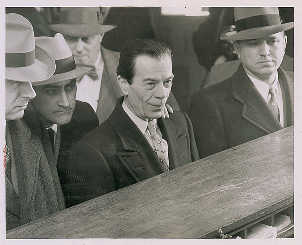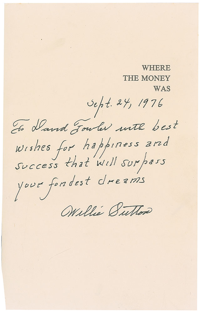 Master bank robber (1901–1980) nicknamed ‘The Actor’ for his success in eluding capture through the use of disguises and odd mannerisms. Felt tip signature and inscription, “Sept. 24, 1976, To David Fowler, with best wishes for happiness and success that will surpass your fondest dreams, Willie Sutton,” on an off-white 5.75 x 9 half-title page removed from his autobiography, Where the Money Was. Also includes an original vintage glossy 10 x 8 press photo of Sutton being booked by the Brooklyn police, stamp-dated February 29, 1952, on the reverse. In overall fine condition, with scattered creases and crazing to the photo. RR Auction COA.