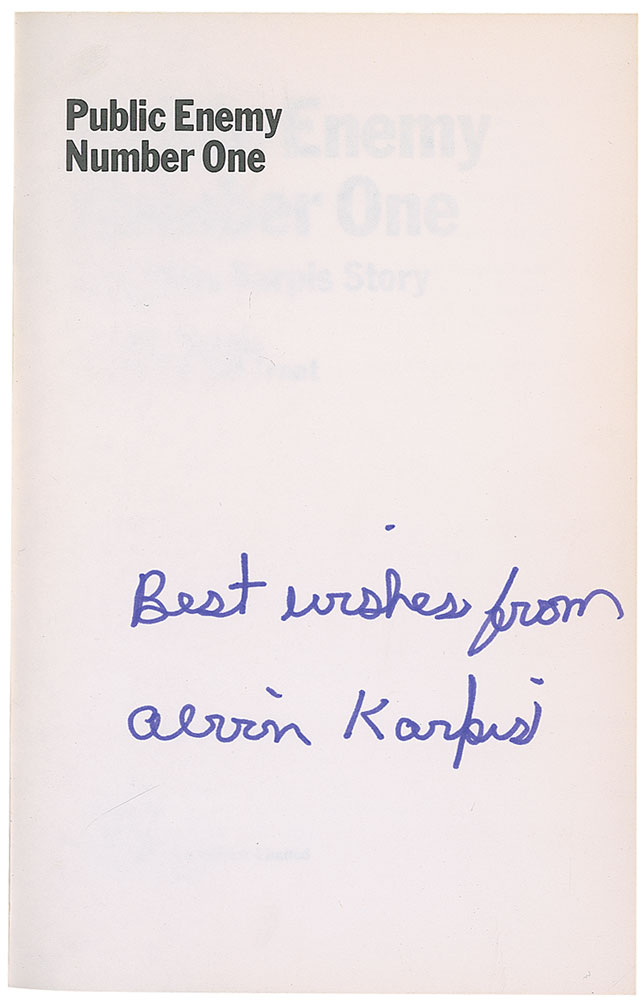 Thief, bankrobber, kidnapper, and bootlegger (1907–1979) nicknamed ‘The Rat’ by J. Edgar Hoover. Signed book: Public Enemy Number One: The Alvin Karpis Story. First edition. Toronto: McClelland and Stewart Limited, 1971. Hardcover with dust jacket, 6 x 8.5, 256 pages. Signed on the half-title page in blue felt tip, “Best wishes from Alvin Karpis.” In fine condition, with a few tears to dust jacket. RR Auction COA.