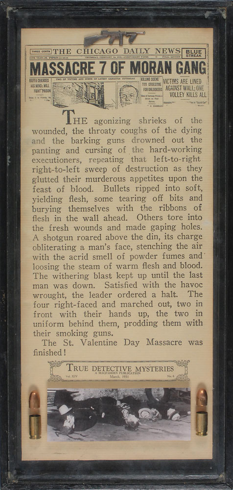 Two bullets and shell casings fired from the ‘Tommy’ guns used in the St. Valentine’s Day Massacre. The two .45 ACP rounds were fired in 2008 by the Quartermaster of the Berrien County Sheriff’s Department and Charles Schauer, a Thompson collector and historian. Rounds are framed against a print with a graphic printed description of the event to an overall size of 9 x 19. Accompanied by a certificate of authenticity from Schauer which states, in part: “This certifies that the .45 caliber ACP bullets and shell casings…were fired from the two Thompson Submachine Guns identified as having been used in the St. Valentine’s Day massacre…The accompanying rounds were fired at the Berrien County Sheriff’s Department Firing Range in Coloma, Michigan on 09 April 2008.” Also accompanied by a typed letter from Schauer stating the bullets were fired into a 55-gallon barrel of water. In fine condition. Intriguing and particularly chilling relics connected to one of the most vicious gangster crimes of all time.
