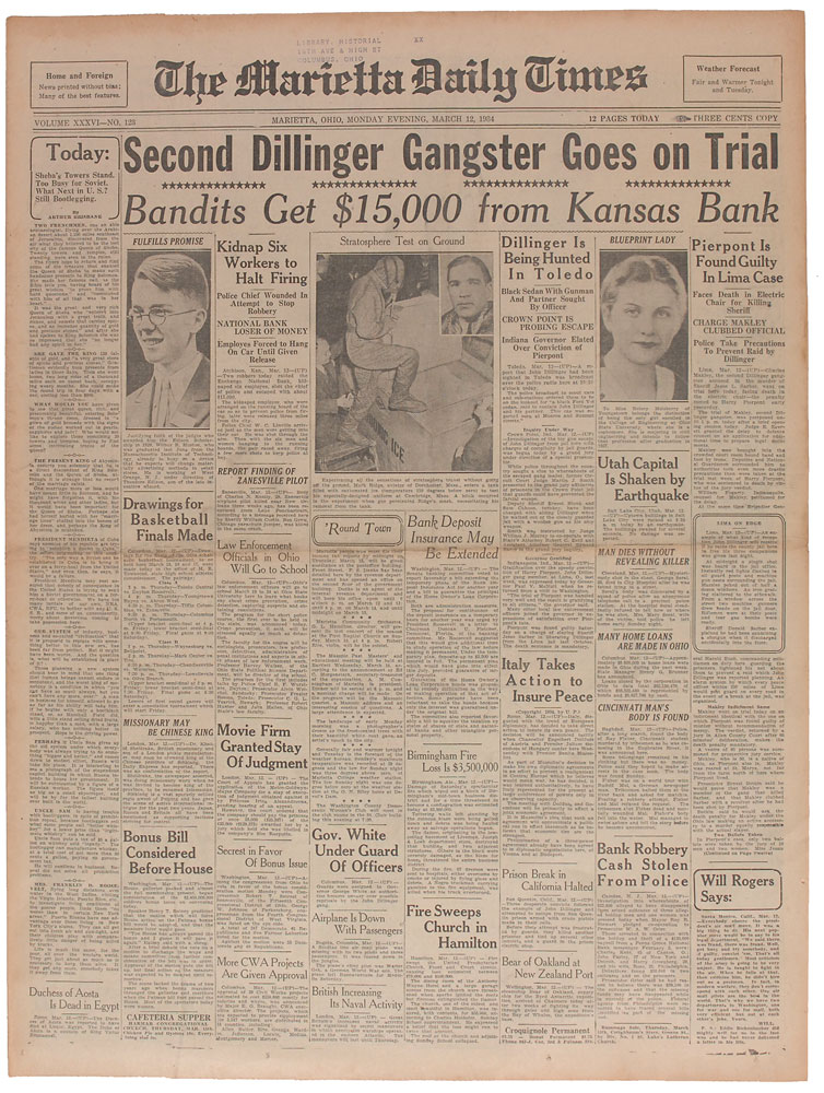 Complete original March 12, 1934, issue of The Marietta Daily Times, 17 x 23, 12 pages. Banner headline announces, “Second Dillinger Gangster Goes on Trial,” and “Bandits Get $15,000 from Kansas Bank.” Another front page headline reads, “Dillinger is Being Hunted in Toledo.” Moderate overall toning, otherwise fine condition. RR Auction COA.