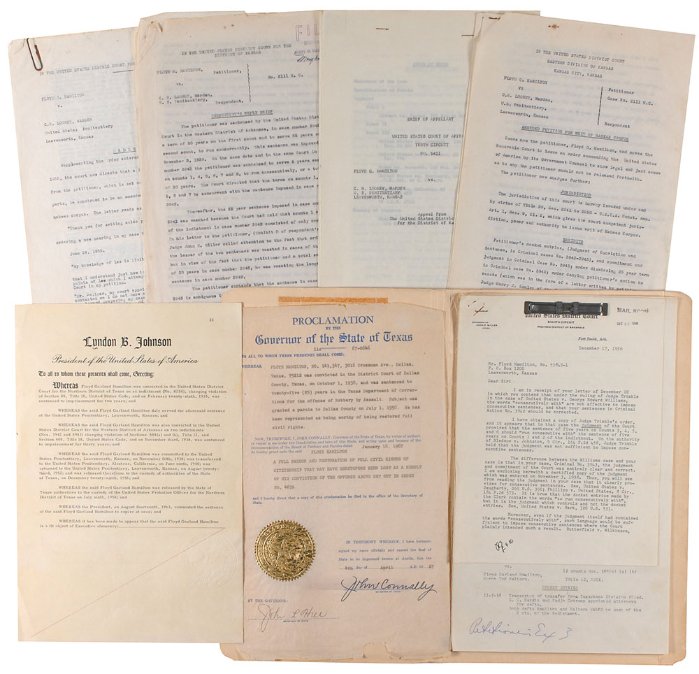 A member of the Barrow gang, arrested for bank robbery and harboring a fugitive while his brother Raymond was on the run with the famous outlaws, Floyd Hamilton continued his life of crime well after the ambush that ended Bonnie and Clyde’s spree. Convicted of a series of offences, ranging from armed bank robberies to transporting stolen automobiles across state lines to numerous assaults, Hamilton was proclaimed Public Enemy #1 by J. Edgar Hoover in 1938. Captured shortly after with fellow gang member Ted Walters, he began one of several 30–year sentences, ordered to be served consecutively. After twenty years in state and federal prisons—including a period at Alcatraz, from which he unsuccessfully attempted to escape in 1943—he was finally paroled in 1958. For his extensive work with ex-convicts and the International Prison Ministry, he received pardons from Texas Governor John Connelly and President Lyndon B. Johnson in 1967 and 1966, respectively. An excellent archive of material related to one of the most notorious gangs in American history. RR Auction COA.