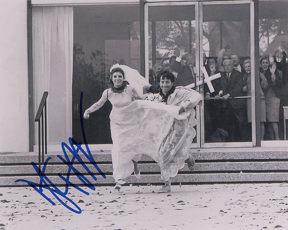 Satin-finish 10 x 8 photo of Hoffman in a scene from The Graduate, signed in blue felt tip. In fine condition. Originally obtained by in-person specialist Mike Wehrmann. Pre-certified PSA/DNA and RR Auction COA.