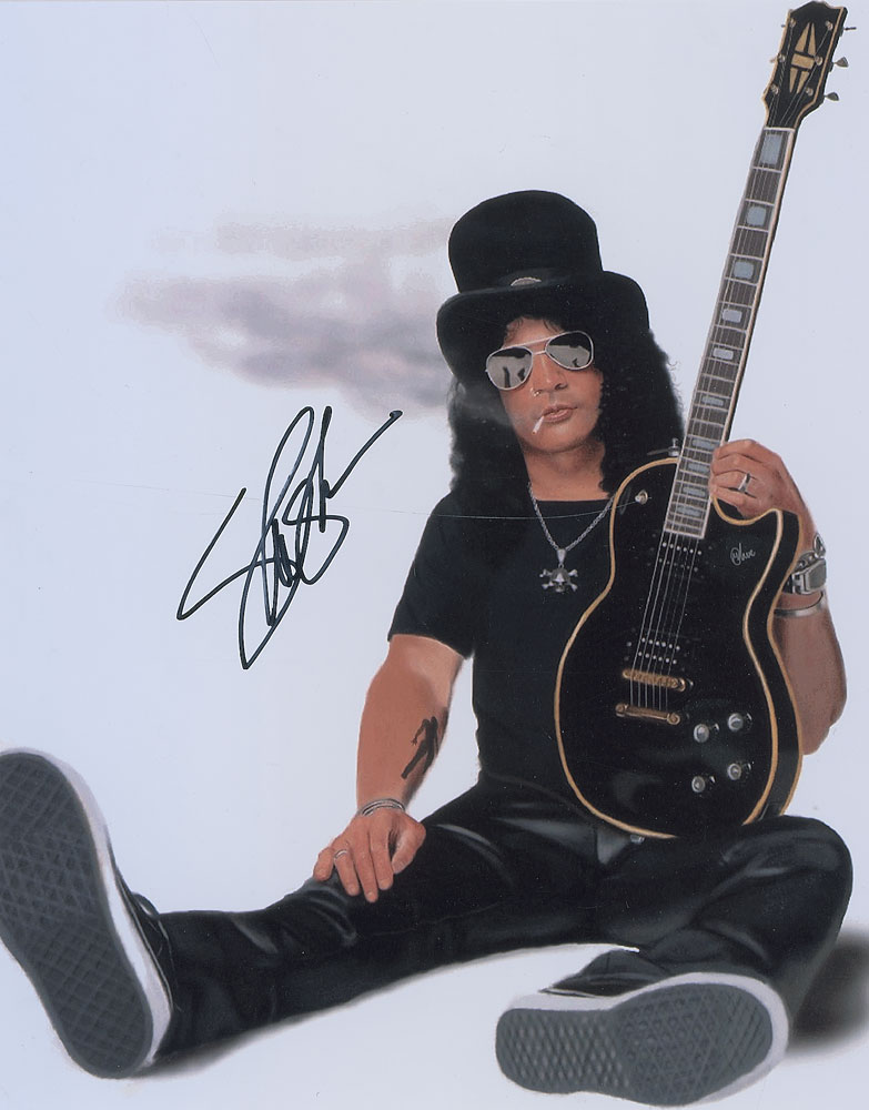 Color satin-finish 11 x 14 photo of Slash sitting on the floor with his guitar, signed in person in black felt tip. In fine condition. Originally obtained by in-person specialist Mike Wehrmann. Pre-certified Roger Epperson/REAL and RR Auction COA.