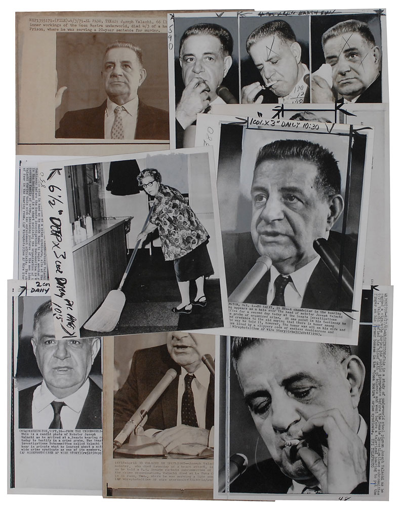 The first Mafia member to publicly acknowledge its existence (1903–1971). Nine original vintage glossy press photos related to Valachi, most approximately 8 x 10, all stamp-dated on the reverse. Photos are dated between 1963 and 1971, and include a mug shot-type portrait, many of Valachi arriving and testifying in court, and one of his wife. In overall fine condition, with normal news use and wear, including production marks and notes. RR Auction COA.