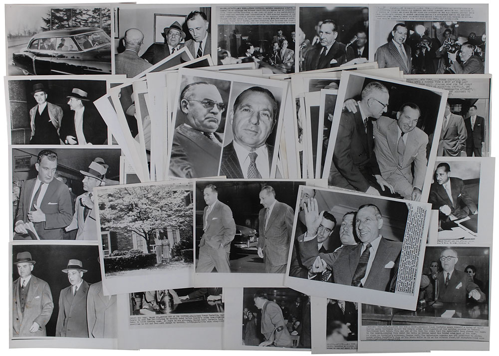 Collection of approximately 53 photos, consisting primarily of glossy press photos, most 7 x 9 or 8 x 10, dated between 1943 and 1961 (majority early 1950s), many bearing inherent captions to the borders. Most photos show Costello in court or conferring with lawyers, and others include him leaving prison, speaking to reporters, and giving money to a panhandler. In overall fine condition, with normal news use and wear. RR Auction COA.