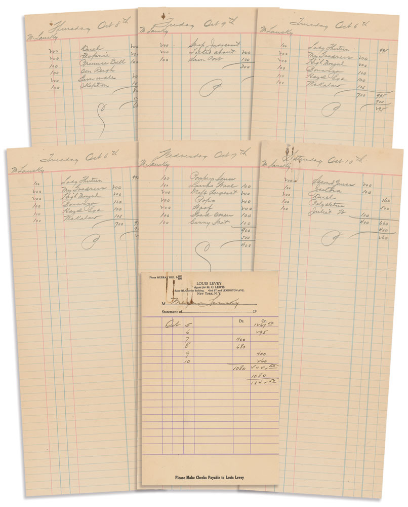 Five lined betting slips, filled out in pencil by Louis Levey, each measuring 5.5 x 14, and dated between October 5 and October 10, circa 1936. Each of the five slips is labeled at the top by Levey, “M. Lansky,” and has between two and seven horses listed on them, with dollar amounts and most likely money won or lost in the adjacent columns. A sheet of Louis Levy lined stationery filled out in ink by Levey is also included, with Lansky’s name written at the top and his five day totals tallied in the adjacent columns. Rusty paperclip and mark to top edge and mild toning, otherwise fine condition. RR Auction COA.