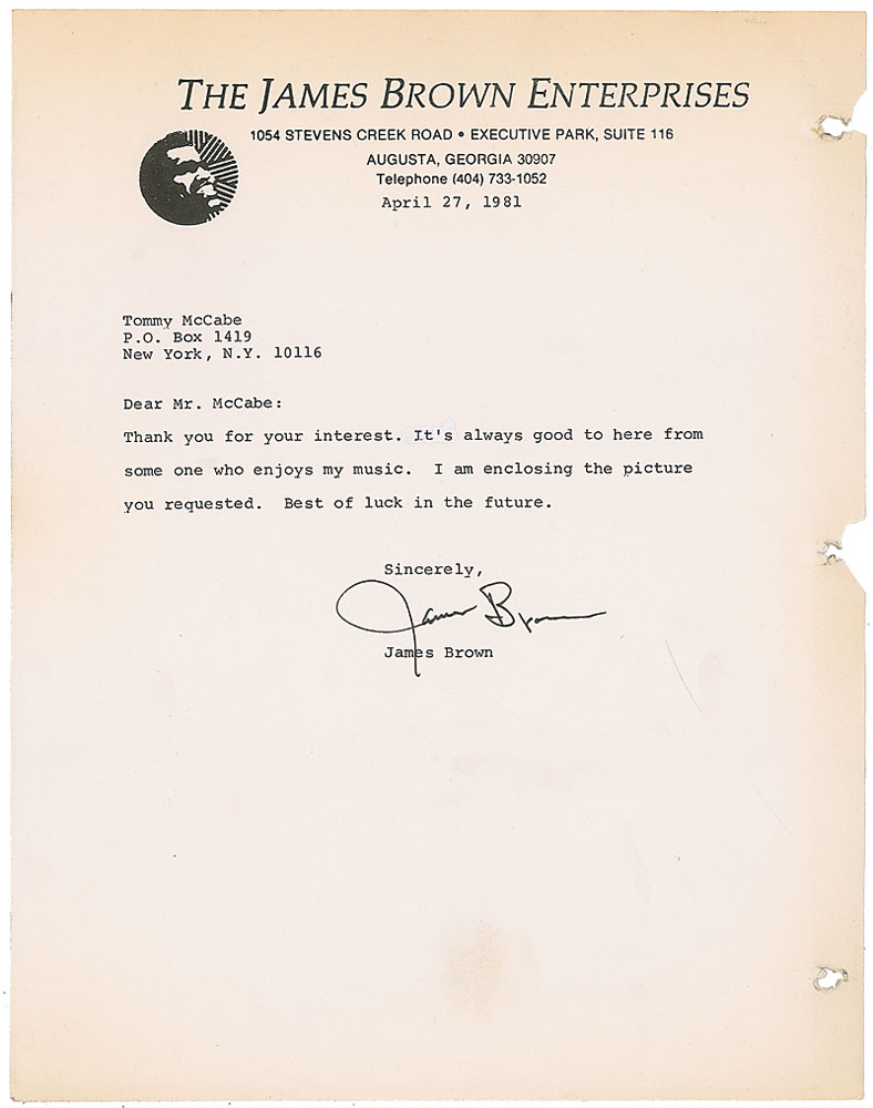 TLS, one page, 8.5 x 11, The James Brown Enterprises letterhead, April 27, 1981. Letter of thanks to an admirer. In full: “Thank you for your interest. It’s always good to here [sic] from some one who enjoys music. I am enclosing the picture you requested. Best of luck in the future.” In very good condition, with torn punch holes to right edge and toning to two edges. Pre-certified Roger Epperson/REAL and RR Auction COA.