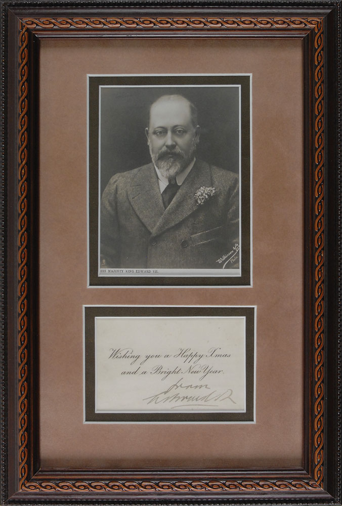 Christmas card, 3.5 x 2.25, with a printed sentiment reading, “Wishing you a Happy Xmas and a bright New Year,” signed underneath, “from Edward R.” Double-matted and framed with a postcard photo to an overall size of 8.25 x 12.25. In fine condition, with a bit of scattered mild foxing. RR Auction COA.