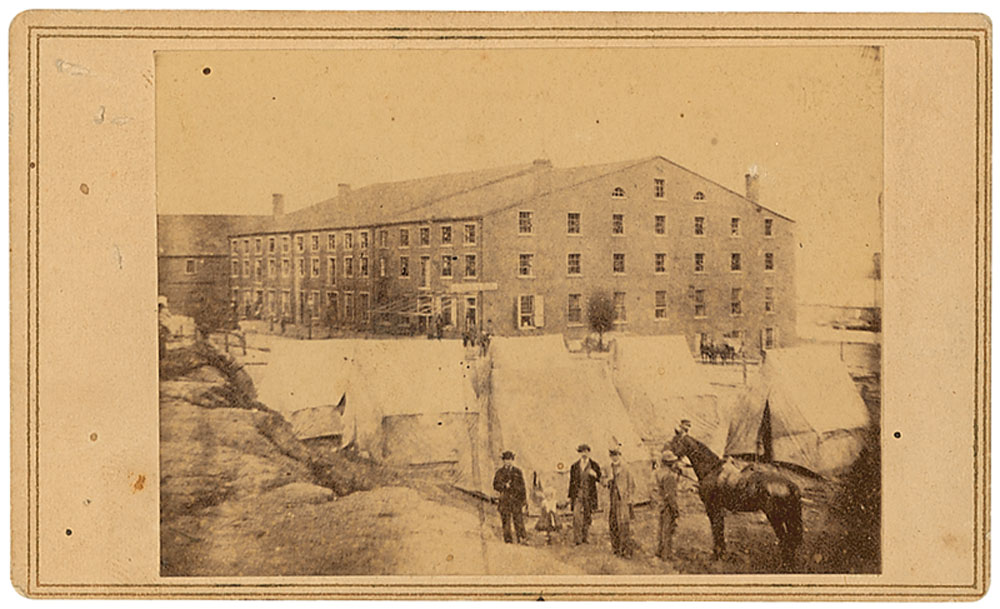 Scarce original 4 x 2.25 carte-de-visite image of the Confederacy’s Libby Prison as it appeared in the summer of 1863, showing soldiers and a horse at a tent encampment set up in front of the main prison building. Published by Gardner of Washington, from a negative attributed to Rees of Richmond. In fine condition, with a few surface marks and dings. RR Auction COA.
