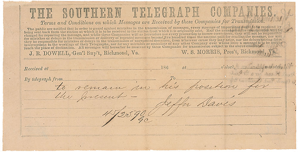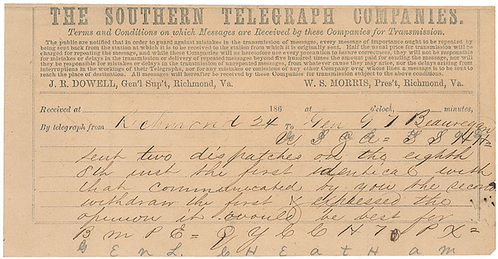 Unsigned manuscript telegram from Jefferson Davis to General P. G. T. Beauregard, two pages, 7.75 x 4, sent from the Southern Telegraph Company in Richmond, no date. In part: “[Genl Hood] sent two dispatches on the eighth 8th inst the first identical with that communicated by you the second withdraw the first & expressed the opinion it would be best for [Genl Cheatham] to remain in his position for the present.” Both names of the generals were written in code and subsequently decoded in pencil. Second page is professionally inlaid into a slightly larger off-white sheet. In overall fine condition. A fascinating example of ciphers used during the Civil War. RR Auction COA.