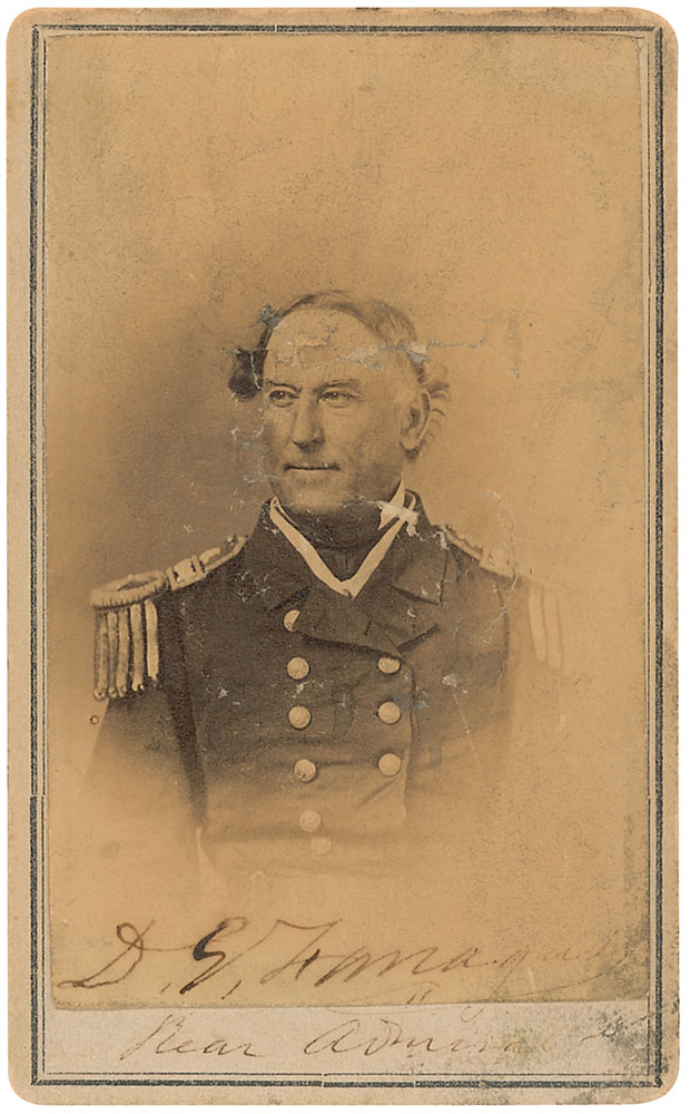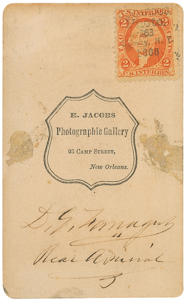 American admiral (1801–1870) who was a flag officer of the Navy during the Civil War. Original 2.25 x 4 carte-de-visite bust portrait of Farragut in uniform, signed at the bottom in black ink, “D. G. Farragut, Rear Admiral,” as well as on the reverse in the same manner. Published by E. Jacobs of New Orleans, and bears a two-cent revenue stamp affixed to reverse. Scattered soiling to the lower right (affecting the end of the signature), scattered marks and dings affecting the image (including his face), and areas of adhesive remnants to the reverse, otherwise very good condition. One of just a handful of signed Farragut photos we have offered, and just the second twice-signed example we have encountered. Pre-certified John Reznikoff/PSA/DNA and RR Auction COA.
