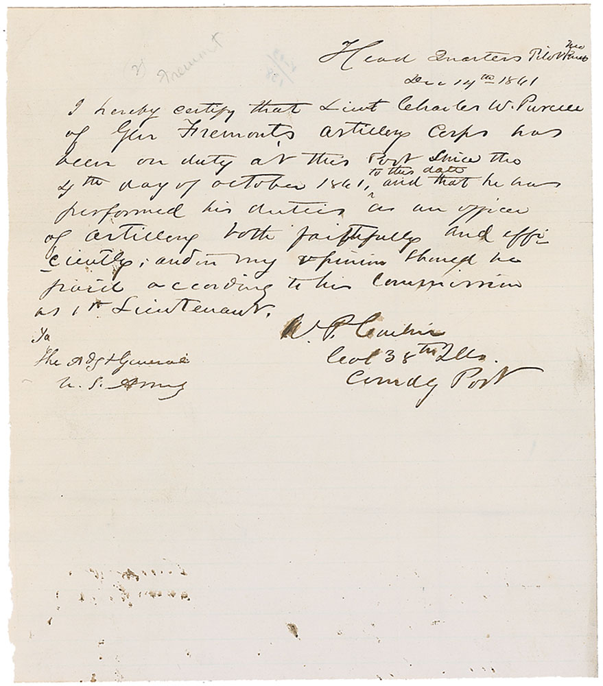 Union general (1829–1903) who commanded brigades at the Battle of Chickamauga, Lookout Mountain, and Missionary Ridge. War-dated ALS signed “W. P. Carlin, Col 38th Ills., Comdg Post,” one page, lightly-lined, 7.75 x 9, December 14, 1861. Letter to the adjutant general of the US Army. In full: “I hereby certify that Lieut. Charles W. Purcell of Gen. Fremont’s Artillery Corps has been on duty at this Post since the 4th day of October 1861, to this date and that he has performed his duties as an officer of artillery both faithfully and efficiently, and in my opinion should be paid according to his Commission as 1st Lieutenant.” Intersecting folds, two through single letters of signature, a few ink spots to signature, and some light mirroring of ink along bottom of page, otherwise fine condition. Pre-certified John Reznikoff/PSA/DNA and RR Auction COA.
