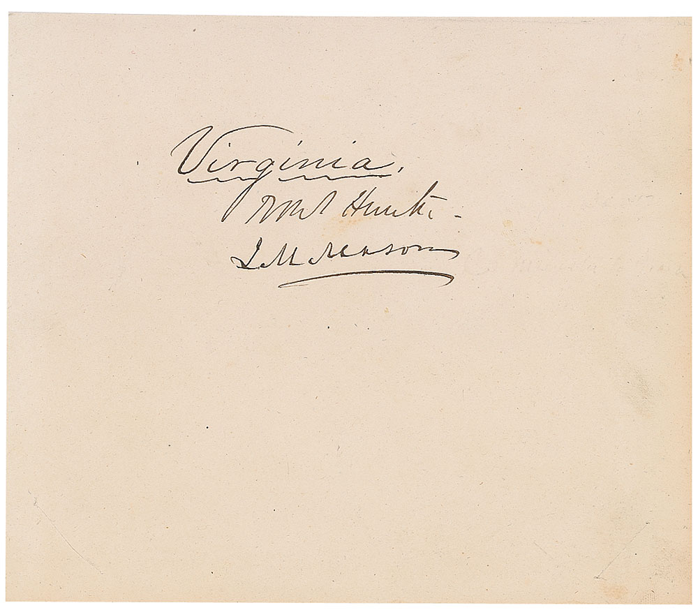 Mason (1798–1871) was appointed commissioner of the Confederacy to the United Kingdom and France; Hunter (1809–1887) served as the Confederate States secretary of state from 1861–62. Ink signatures, “R. M. T. Hunter,” and “J. M. Mason,” on an off-white 6 x 5 sheet, headed above the signatures in an unknown hand, “Virginia.” In fine condition. RR Auction COA.