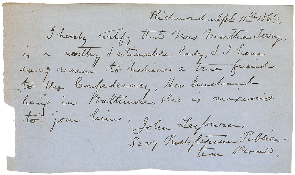 Influential southern clergyman in the Confederacy (1814–1893). Rare war-dated ADS, signed “John Leyburn, Secy. Presbyterian Publication Branch,” one page, 8.5 x 5, April 11, 1864. Pass request reads, in full: “I hereby certify that Mrs. Martha Terry is a worthy & estimable lady, & I have every reason to believe a true friend to the Confederacy. Her husband being in Baltimore, she is anxious to join him.” In very good condition, with intersecting folds, paper loss to left edge, mounting remnants to reverse and some mild toning. RR Auction COA.