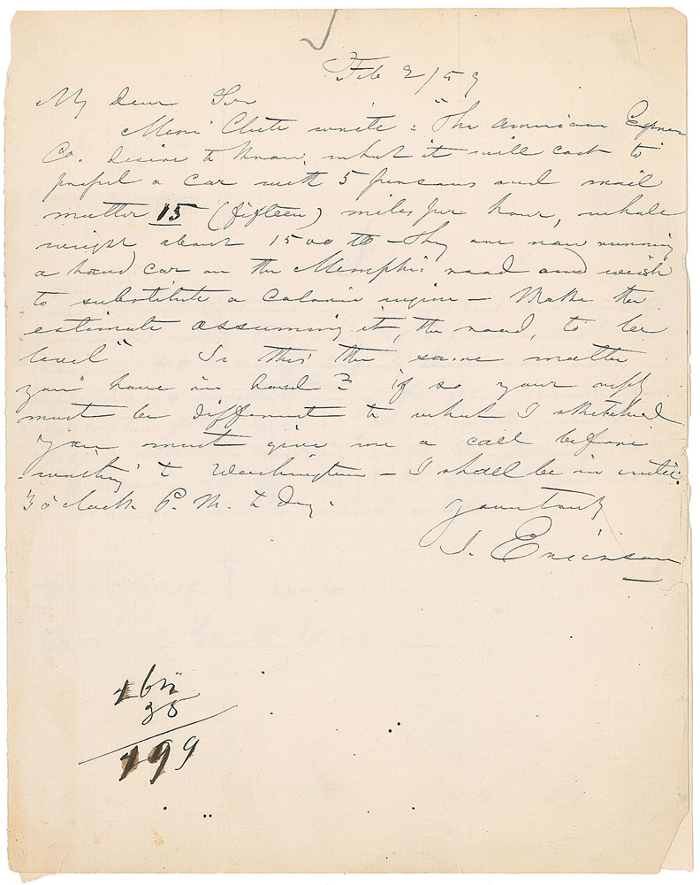 Swedish-American Army engineer (1803–1889) who designed and built the ironclad warship Monitor for the American Navy. ALS signed “J. Ericsson,” one page, 8 x 10, February 2, 1859. Letter to an unidentified gentleman. In part: “Messrs. Clute write ‘The American Express Co. desire to know, what will cost to propel a car with 5 persons and mail matter 15 (fifteen) miles per hour, whole weight about 1500 lb.—they are now running a hand car on the Memphis [rail]road and wish to substitute a Caloric engine. Make the estimate assuming it, the road, to be level.’” Also included is an unsigned handwritten proposal by Ericsson in which he writes, in part: “Two 24 inch Caloric engines applied to a suitable carriage with two pair of 3 feet wheels, will traverse 40 miles of perfectly level rail way in three hours with 3 tons of freight, besides fuel.” In very good condition, with intersecting folds, one through first initial of signature, ink and pencil notations to both pages, small edge tears, and light toning. In 1853, Ericsson saw his caloric ship—an attempt at a vessel propelled entirely by an engine designed on his warm-air principle—come to fruition. Unfortunately the maritime application was unsuccessful, and Ericsson devoted himself to improvements on the engine for other mechanical purposes. Pre-certified John Reznikoff/PSA/DNA and RR Auction COA.