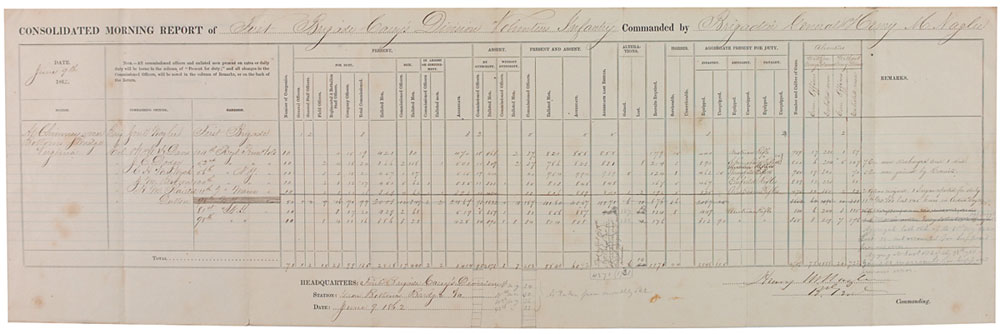 Union general who commanded a brigade in the Army of the Potomac during the Peninsula Campaign (1815–1886). Civil War–dated partly-printed DS, signed “Henry M. Naglee, Br. Genl.,” one page, 26 x 8.25, June 9, 1862. A “Consolidated Morning Report of First Brigade Casey’s Division…Commanded by Brigadier General Henry M. Naglee,” with manuscript listings of the brigade’s colonels, their garrisons, and number of soldiers. Signed at the conclusion by Naglee. In fine condition, with light scattered foxing and expected document wear. Pre-certified John Reznikoff/PSA/DNA and RR Auction COA.