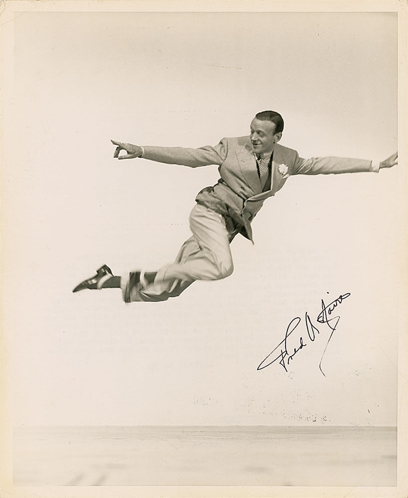 Glossy 8 x 10 photo of Astaire leaping into the air while filming Yolanda and the Thief, signed in black ink. Some creasing to corners, otherwise fine condition. Pre-certified PSA/DNA and RR Auction COA.