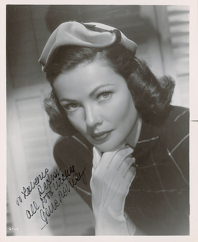 Glossy 8 x 10 photo of Tierney with her gloved hand on her chin, signed and inscribed in black felt tip, “To LaVerne Decker, all good wishes, Gene Tierney.” In fine condition. Pre-certified PSA/DNA and RR Auction COA.