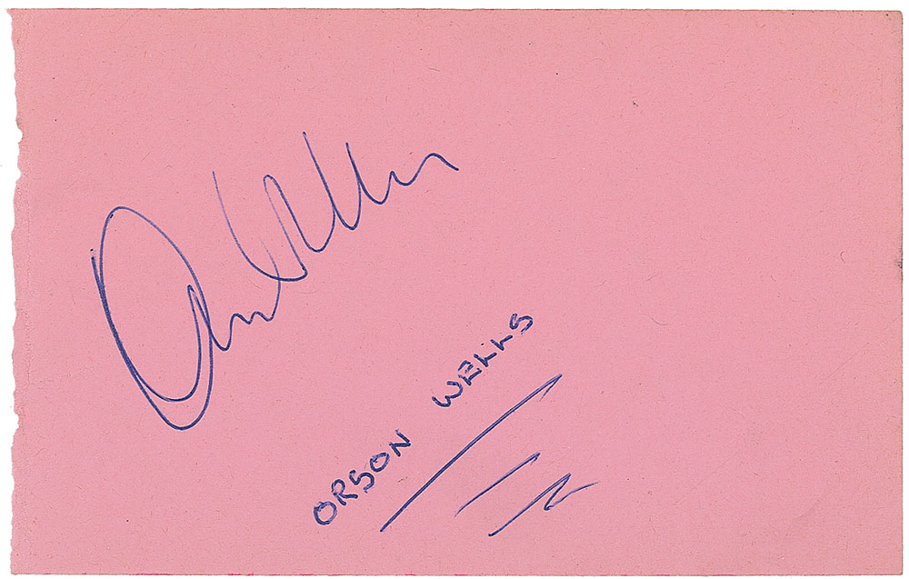 Ballpoint signature, “Orson Welles,” on a pink 4.75 x 3 album page with a collector’s notation under signature. In fine condition, a small surface tear to left edge. Reverse bears the signatures of two members of the Hollies, including Graham Nash. Consignor notes that the signatures were obtained at London’s Heathrow Airport circa mid-1960s to mid-1970s. Pre-certified PSA/DNA and RR Auction COA.