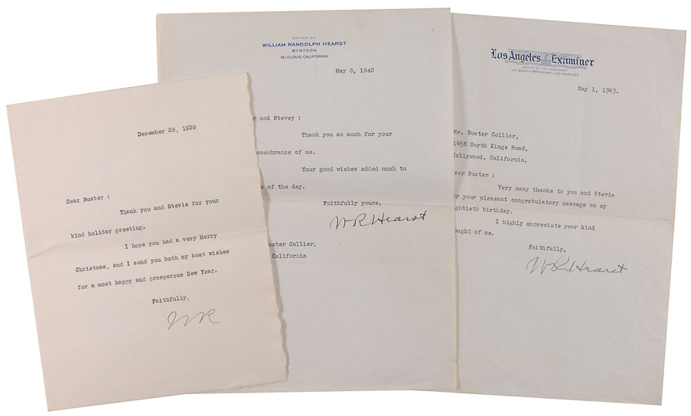 Three TLSs to Buster, each one page, various sizes, dated between 1939 and 1943. Two letters, each signed “W. R. Hearst,” express gratitude for birthday wishes, and one letter, signed “W. R.” extends holiday greetings. In overall fine condition. All are accompanied by certificates of authenticity from PSA/DNA. Provenance: William Collier Family Collection. Pre-certified PSA/DNA and RR Auction COA.
