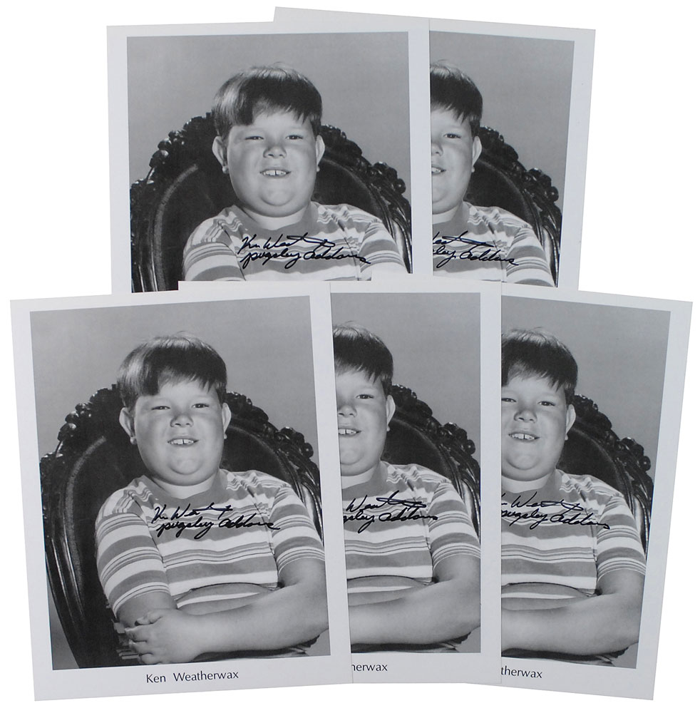 Five identical 8 x 10 cardstock photos of Weatherwax in character, each signed in black felt tip “Ken Weatherwax, Pugsley Addams.” In overall fine condition. RR Auction COA.