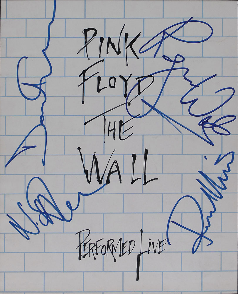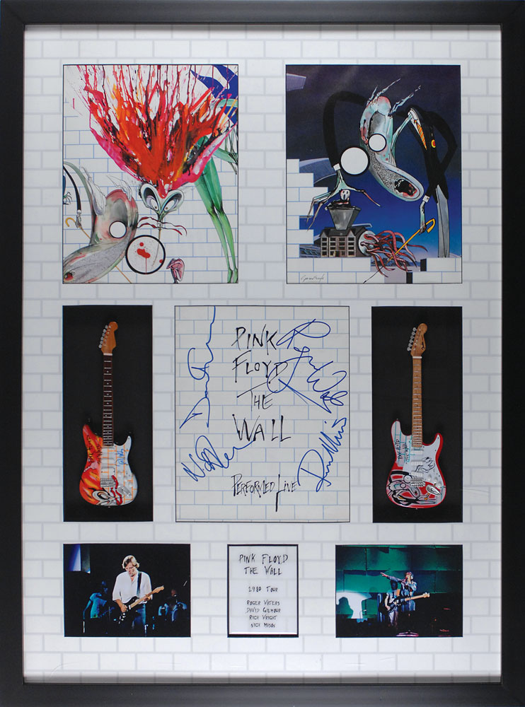 The Wall concert tour program, 9 x 11.5, signed on the front cover in blue felt tip by Roger Waters, David Gilmour, Rick Wright, and Nick Mason. Matted and framed against a Wall background (with acid-free backing and 98% UV resistant plexiglass) along with color pages of Wife and Teacher from another program, two replica mini-guitars, and two photos from a Wall concert to an overall size of 27.5 x 37. In fine condition. Accompanied by a full letter of authenticity from Roger Epperson/REAL. A spectacular display of one of their most popular and well-respected works. RR Auction COA.