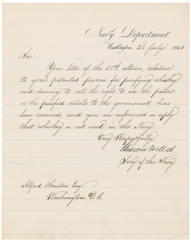 Civil War–dated LS, one page, lightly-lined, 7.75 x 9.75, Navy Department letterhead, Washington, July 2, 1864. Letter to an inventor. In part: “Relative to your patented process for purifying whiskey and desiring to sell the right to use the patent or the purified article to the government…you are informed in reply that whiskey is not used in the Navy.” In fine condition. Pre-certified PSA/DNA.