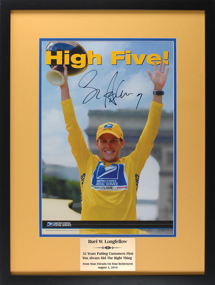 Color 11.75 x 17 poster of Armstrong celebrating his Tour de France victory, signed in black felt tip. Double-matted and framed with a presentation plaque for Ruel W. Longfellow’s retirement to an overall size of 19.25 x 25.5. In fine condition. Oversized. Pre-certified Steve Grad/PSA/DNA and RR Auction COA.