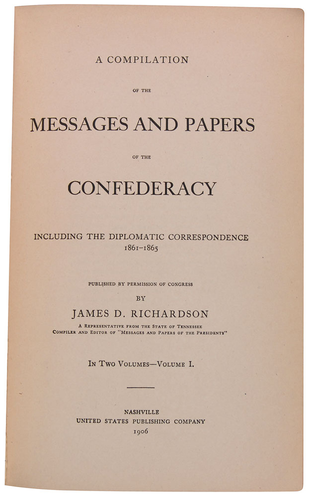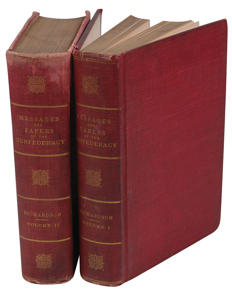 Books: A Compilation of the Messages and Papers of the Confederacy, two volumes, by James D. Richardson. Nashville: United States Publishing Company, 1906. Hardcover, 6.5 x 9.25, 643 and 760 pages. Book condition: G/None. Both volumes bound in red cloth with gilt titles on spines and gilted upper textblock edges. Both have worn edges, with small chips and tears in cloth; sunning and soiling to exteriors; slightly yellowed textblocks with some minor scattered foxing. Volume I completely split along front interior hinge and partially split along rear. Volume II has water damage to upper third of exterior with staining to first/last several pages; rear hinge and few interior hinges partially cracked. RR Auction COA.