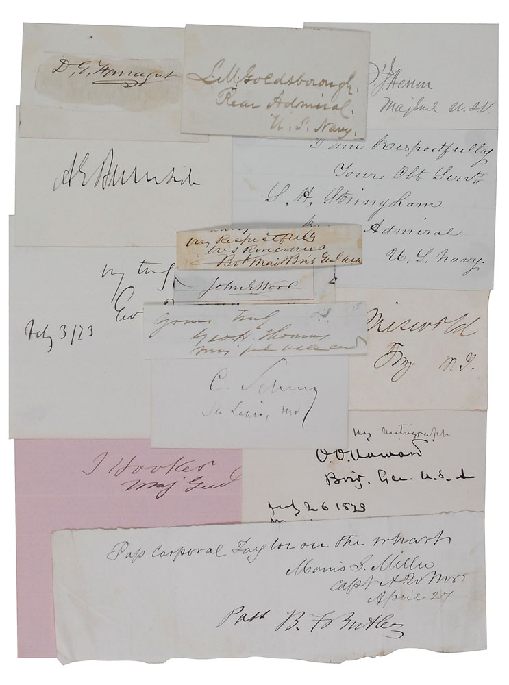 Fourteen ink signatures of different Union officers on slips, sheets, and cards of various sizes. Signers are: David G. Farragut, Joseph Hooker, Ambrose Burnside, O. O. Howard, George B. McClellan, William S. Rosecrans, John E. Wool, Benjamin Butler, Carl Schurz, Silas Stringham, George H. Thomas, Louis M. Goldsborough, Francis J. Herron, and John A. Griswold. In overall fine condition.