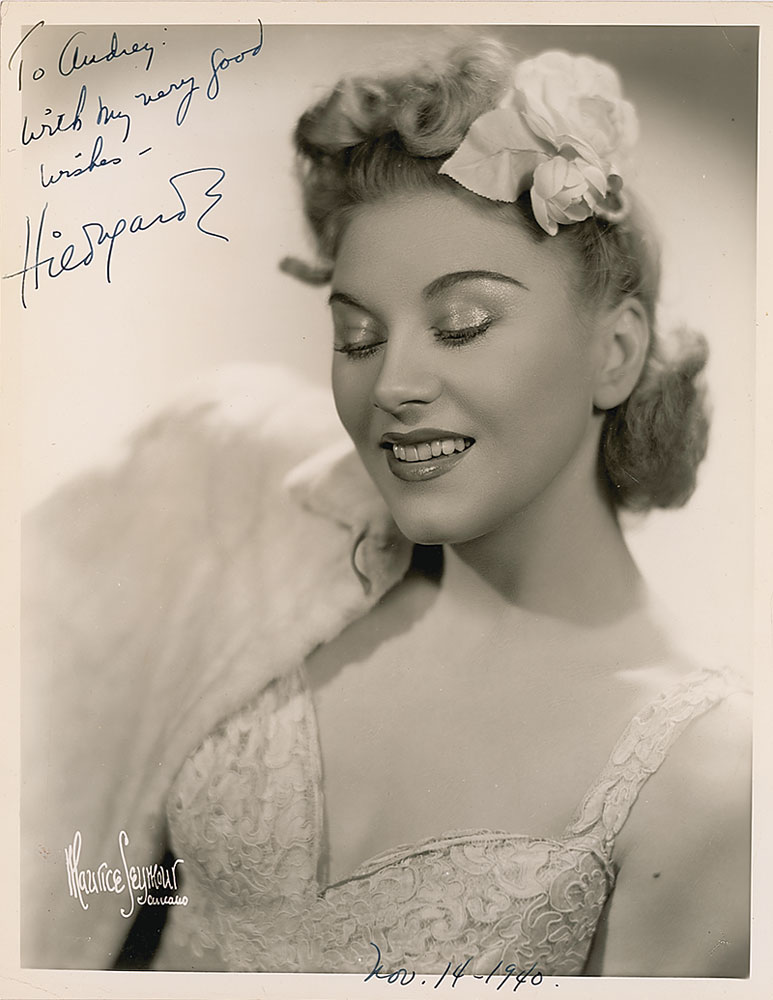 Vintage glossy 8 x 10 photo, signed and inscribed in fountain pen, “To Audrey: With my very good wishes—Hildegarde,” with a collector’s notation along the bottom edge of “Nov. 14, 1940.” In fine condition, with a few faint dings and corner bends. Pre-certified PSA/DNA and RR Auction COA.