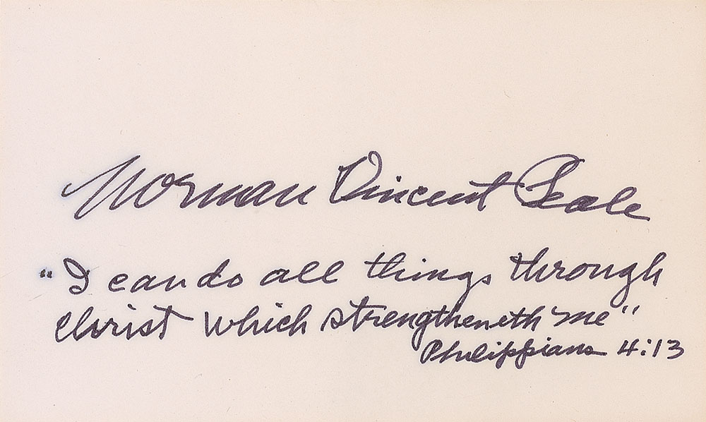 AQS on an off-white 5 x 3 card. Peale pens a biblical quote. In full: “‘I can do all things through Christ which stengtheneth me,’ Philippians 4:13.” In very fine condition. Accompanied by an unsigned Guideposts booklet featuring an article written by Peale. RR Auction COA.