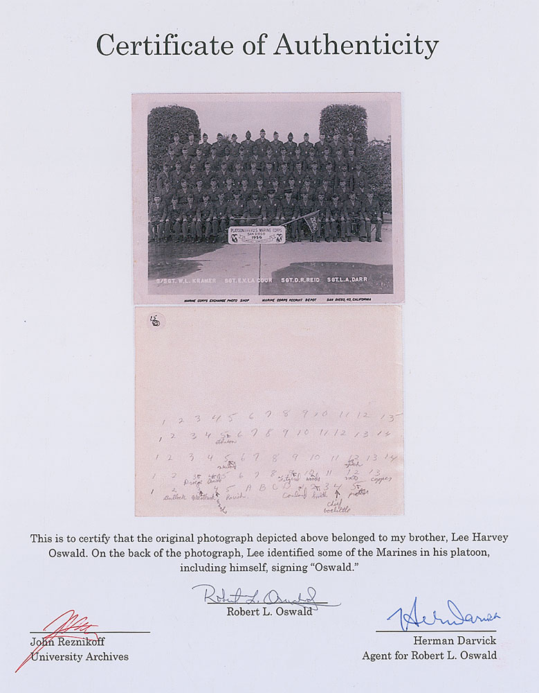Oswald’s personally-owned vintage glossy 10.25 x 8 photo of the 1956 US Marine Corps Platoon 2060 in San Diego, annotated on the reverse by Oswald in pencil to identify some of his classmates, including himself, “Oswald.” Oswald is seen fourth from the left on the second level. In very good condition, scattered surface creases, a tiny tear to left edge, and small circular label affixed to reverse upper left. Accompanied by a letter of authenticity from his older brother, Robert L. Oswald. As Oswald had only been accepted into the Marines on October 24, 1956, this photo is from very early in his three-year stint in the military. He was first trained in the use of the M1 rifle in San Diego during this period and became a reasonably competent rifleman, initially earning the designation of ‘sharpshooter’ before being downgraded to ‘marksman.’ RR Auction COA.