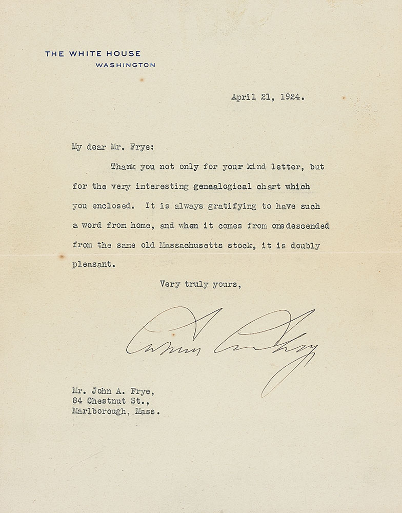 TLS as president, one page, 7 x 9, White House letterhead, April 21, 1924. Letter of thanks for a previously sent letter. In part: “Thank you…for the very interesting genealogical chart which you enclosed. It is always gratifying to have such a word from home, and when it comes from one descended from the same old Massachusetts stock, it is doubly pleasant.” Two diagonal creases, one extending into last name of signature, and a few trivial spots of foxing, otherwise fine condition. Accompanied by the original mailing envelope. Pre-certified John Reznikoff/PSA/DNA and RR Auction COA.